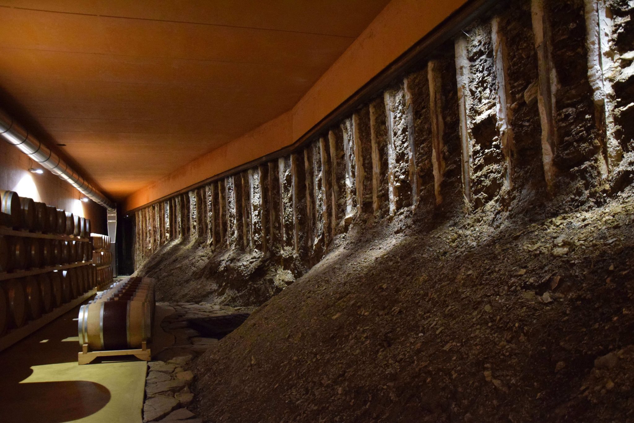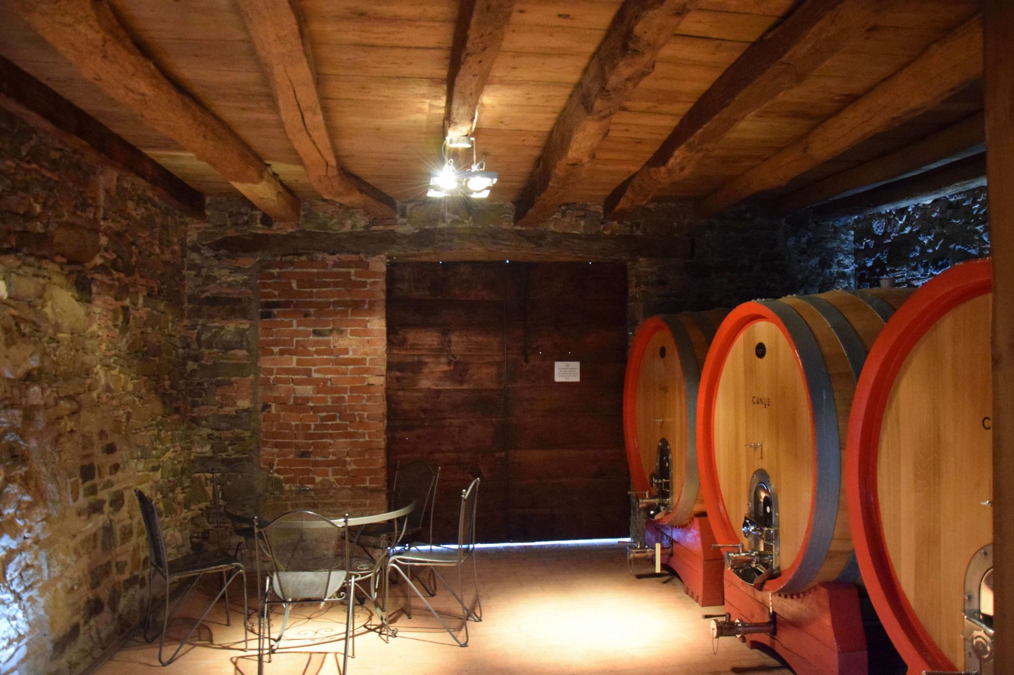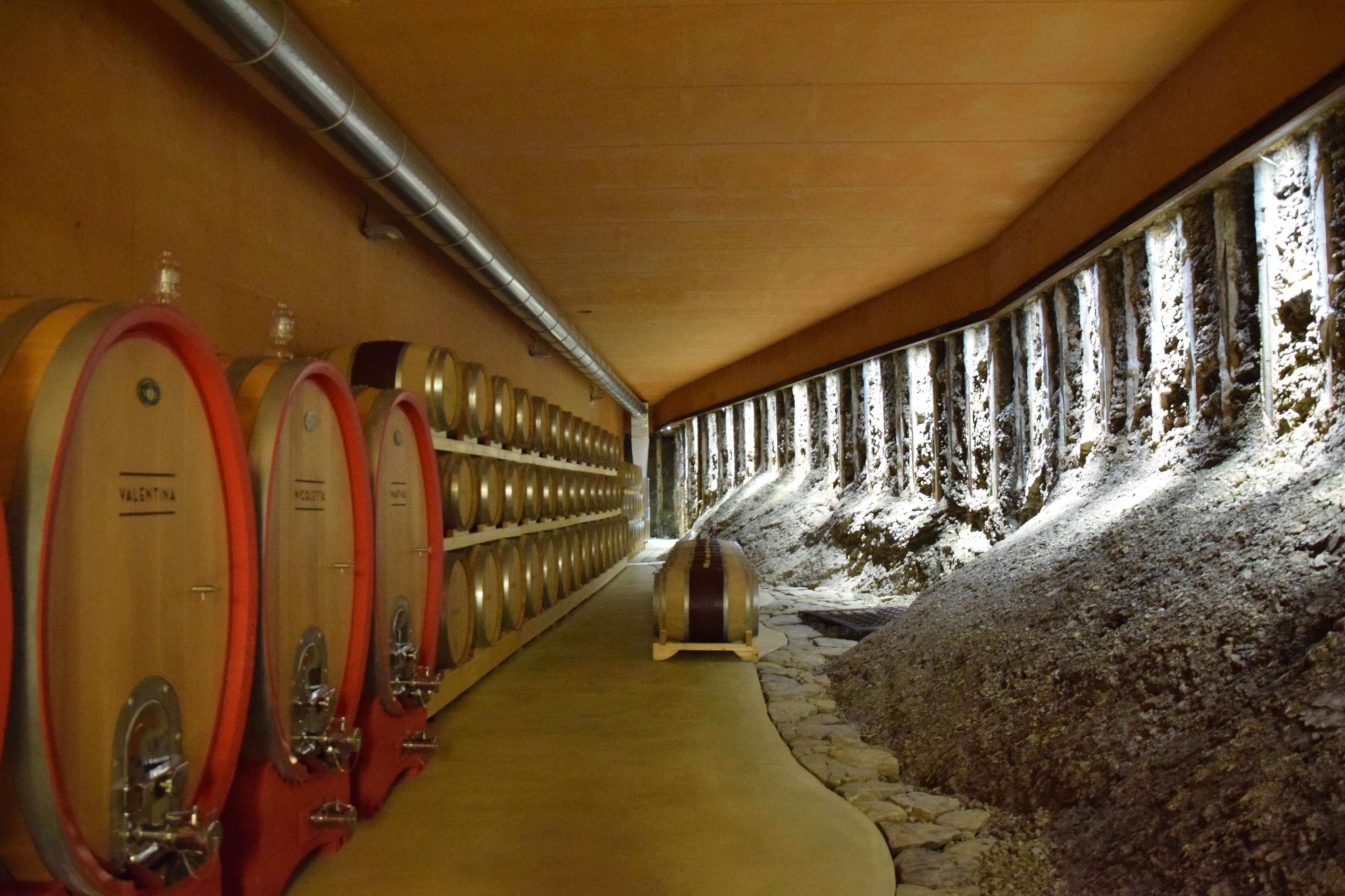 Abbandoniamo il forte vento sulle colline ed Elisabetta e Simone mi portano nel cuore dell’azienda. Entriamo dalla sala degustazione, dove poi torneremo, e passeggiando in questa piccola realtà tra i serbatoi di acciaio Simone mi innonda, soddisfacendo la mia curiosità, di nozioni tecniche. C’è una porta che però attira la mia attenzione… Elisabetta pian piano la spalanca e mi fa immergere in un altro mondo: qui riposa il vino (principalmente rosso) nel legno. Le luci creano un sotterraneo d’incanto: da un lato le botti, dall’altro una parete di ponca, lasciata al naturale. L’aria che si respira qui sotto è magica e profuma di uva, mosto, legno e mineralità.