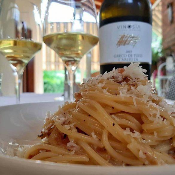 L'abbinamento, secondo me azzeccato, tra carbonara e Greco di Tufo DOCG 2015 L'Ariella della cantina Vinosia.